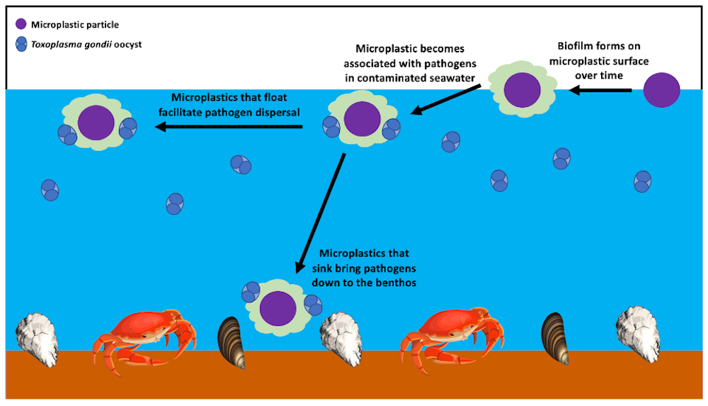 Unlike other pathogens that are commonly found in seawater, the pathogens we focused on are derived from terrestrial animal and human hosts. Their presence in marine environments is entirely due to fecal waste contamination that ends up in the sea. Our study shows that microplastics could also serve as transport systems for these parasites.